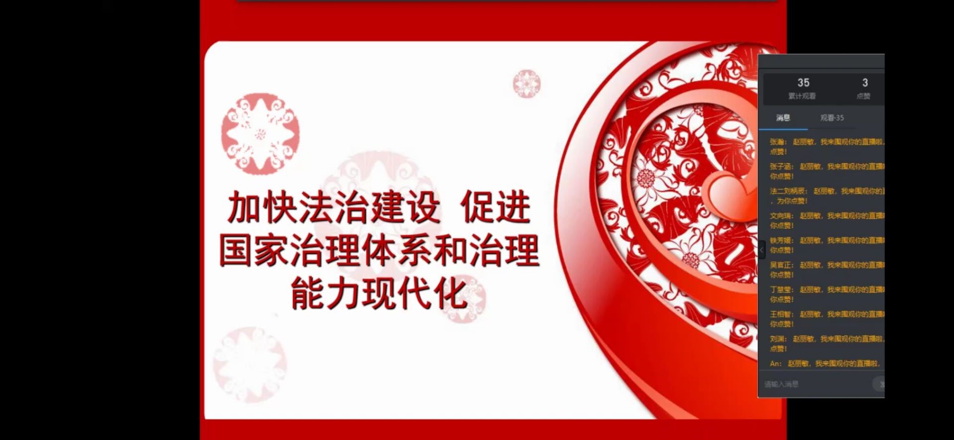 为了深入学习贯彻党的十九届四中全会精神,为推进国家治理体系和治理能力现代化贡献法治力量,2020年4月19日上午9时许,我院副院长赵丽敏老师以“加快法治建设,推进国家治理体系和治理能力现代化”为主题,为17级、18级和19级部分入党积极分子上了一堂生动而又深刻的线上主题教育党课。