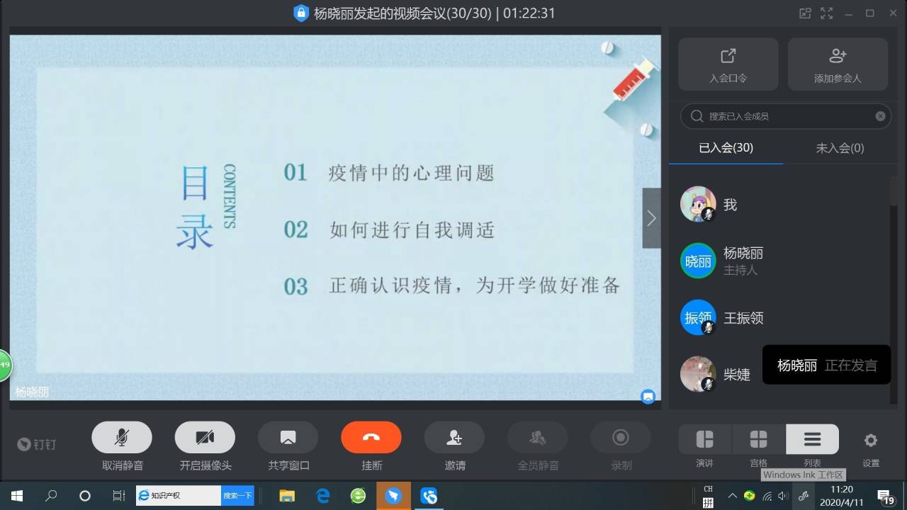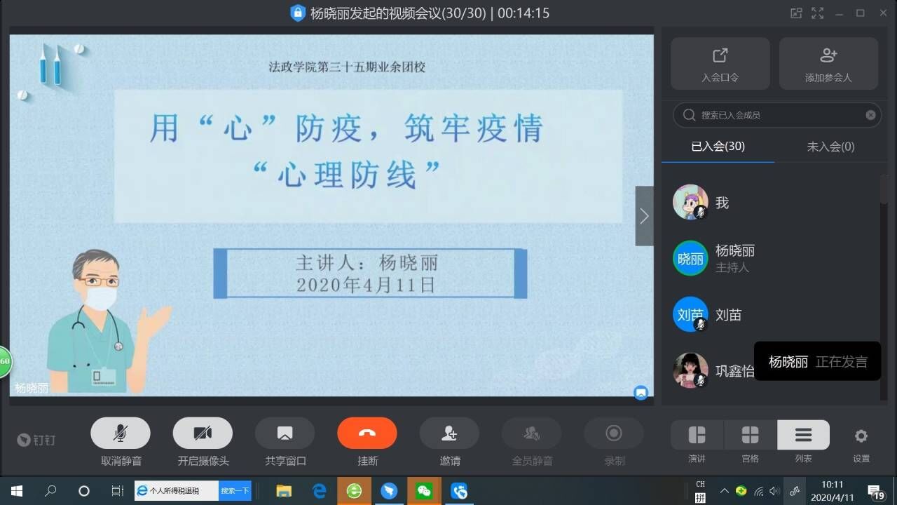 为进一步助力疫情防控工作,将入党积极分子的思想和行动统一到习近平总书记重要指示精神上来,提高入党积极分子在疫情中的自我保护意识、增强其社会责任感,坚定入党积极分子在疫情防控工作中跟党走的理想信念,有行动、作贡献,2020年4月11日,我院团总支负责人杨晓丽老师通过视频会议的方式讲授了“用心防疫,筑牢疫情心理防线”网上主题团课,18、19级入党积极分子全体参与学习。