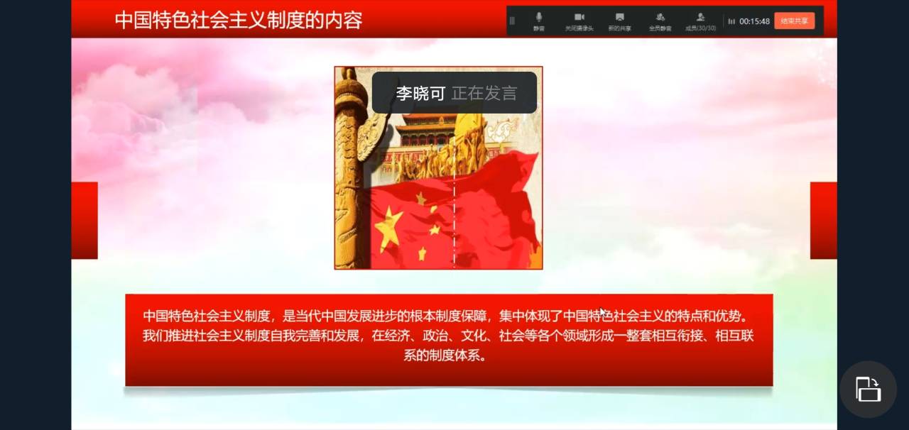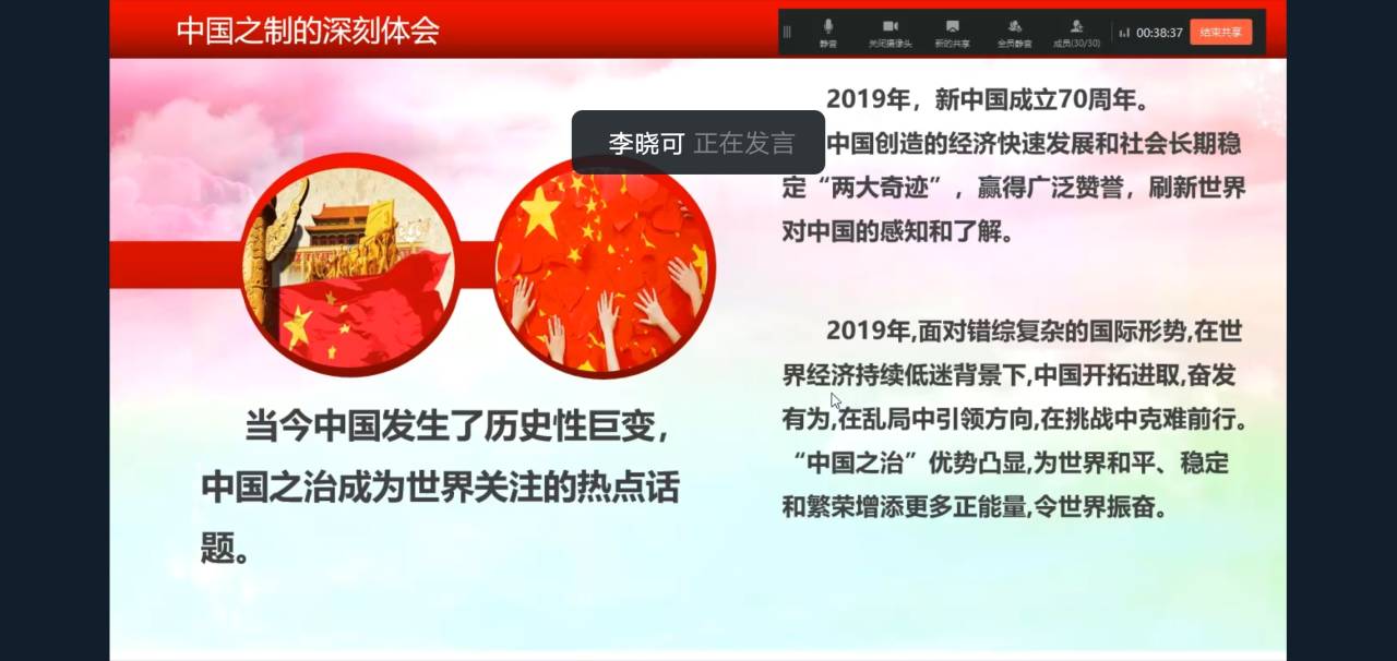 为了进一步加强团员们在全球战“疫”时期的政治思想观念,更好地认识中国特色社会主义制度的显著优势,进一步激发我院团员爱党爱国爱社会主义的巨大热情和责任担当。2020年4月12日上午10点半,我院19级辅导员李晓可老师通过视频会议的方式为18、19级入党积极分子讲授了“坚定中国特色社会主义制度”的主题团课。