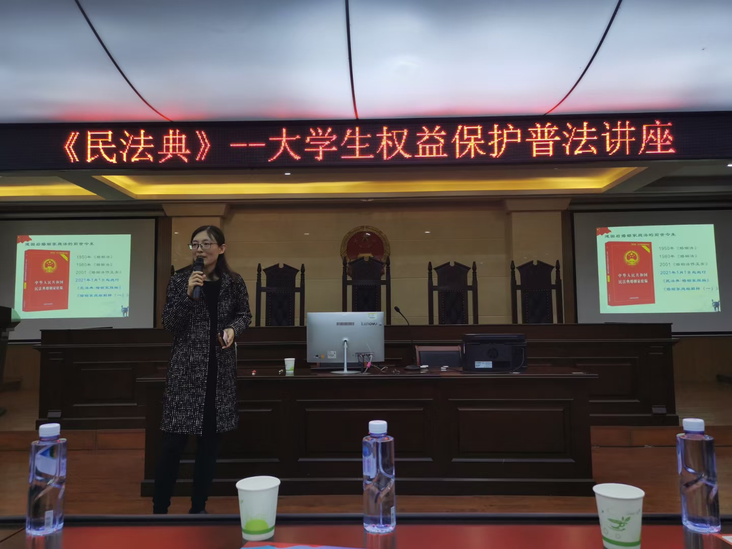 4月23日下午,我院在C楼模拟法庭开展《民法典》大学生权益保护普法教育讲座,本次讲座由我院魏庆爽老师主讲,张一凡同学主持,我院团委副书记杨晓丽老师、校学生会李铭扬同学和全校200余名学生参加此次讲座。