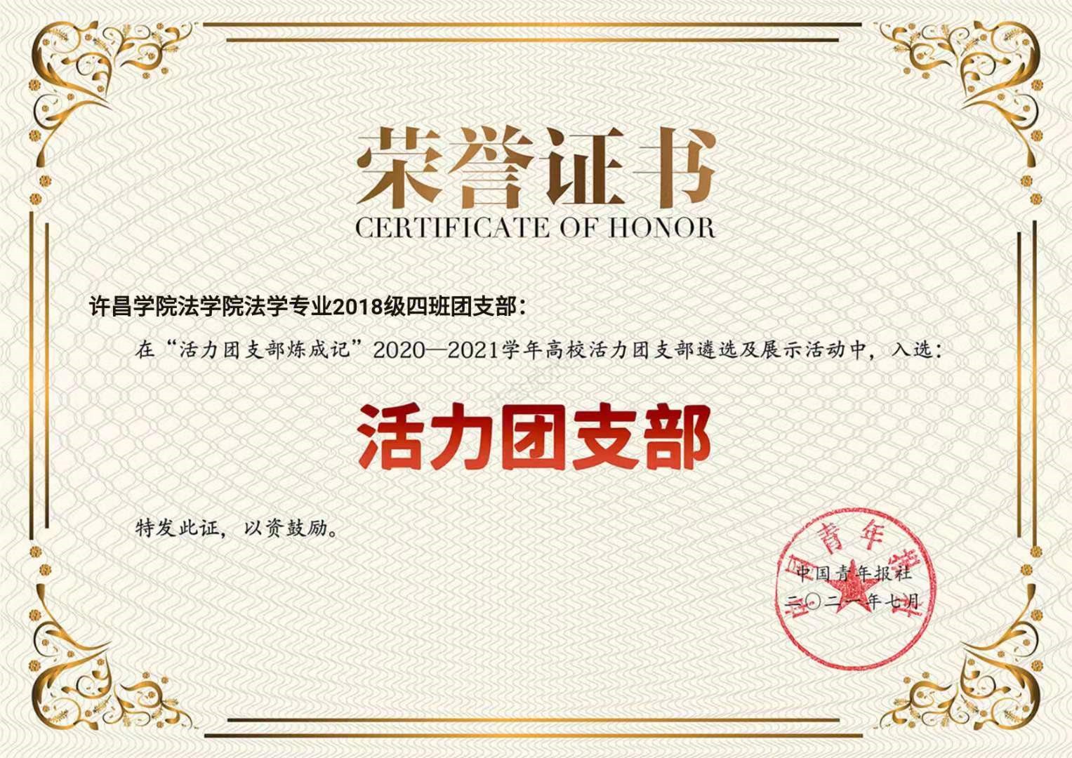 近日,由团中央基层建设部指导、中国青年报社组织开展的“活力团支部炼成记”2020-2021学年全国高校“活力团支部”创建遴选活动结果揭晓。经校级申报、省级初评、网络展示、全国终审等环节,我院法学专业2018级四班团支部荣获2020-2021学年全国高校“活力团支部”荣誉称号。