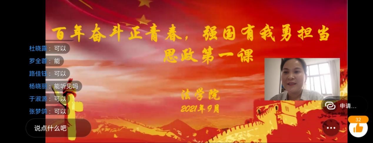 为不断深入推进“把灾难当教材 与祖国共成长”主题教育活动,落实立德树人根本任务,进一步凝聚人心,强化责任使命,激发爱国热情,以良好的精神面貌迎接新学期,法学院于2021年9月6日开展了“百年奋斗正青春 强国有我勇担当”思政第一课,引导同学们进一步感悟初心与使命、奋斗与团结、奇迹与感动。