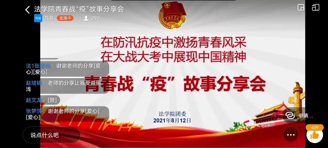 为了在防汛抗疫中激扬青春风采,在大战大考中展现中国精神。2021年8月12日,我院通过网络直播的形式开展了一场特别的青春战“疫”故事分享会,我院团委副书记杨晓丽老师与300余名学生相聚“云”端,共同战“疫”。
