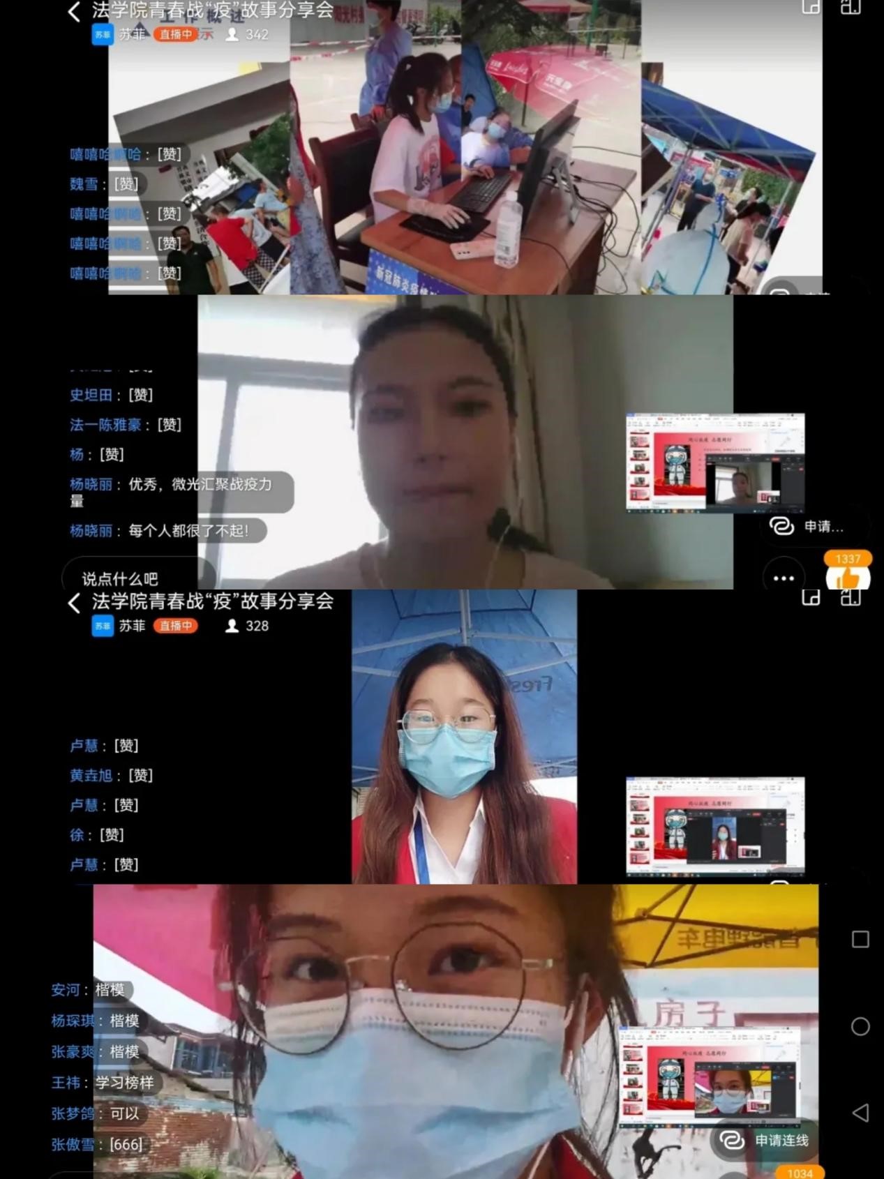 分享会上,首先由我院团委副书记杨晓丽老师介绍当前“涝”“疫”结合的严峻形势和学生志愿者参与防汛抗疫的服务成果,并提醒同学在疫情反弹期间,当好自己健康的第一责任人,争做全民抗疫的自觉践行者。接着,我院学生志愿者在分享会上结合现场讲述、视频短片、PPT屏幕共享等多种形式,分享了自己在疫情防控阻击战中的战“疫”故事。分享会上质朴的语言、感人的心声、坚定的神情令让身处全国各地的法学院学子深受感动、热血沸腾,同学们纷纷在屏幕上留言点赞,分享会气氛热烈、鼓舞人心、能量爆棚。