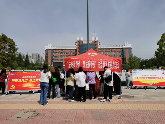 4月22日,法学院在校内通过悬挂宣传条幅、摆放宣传展板、分发宣传彩页、设置法律知识有奖竞答等多种形式进行校园普法。户外宣传活动当天,我校纪委书记王东晓在法学院领导班子等一行人的陪同下,前往弘毅广场活动现场,详细了解活动开展情况。