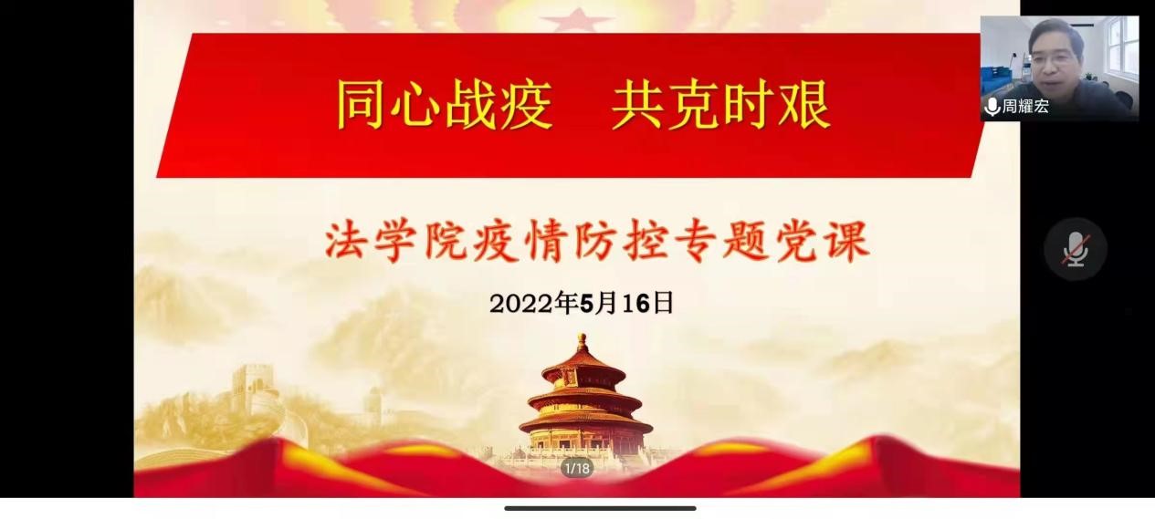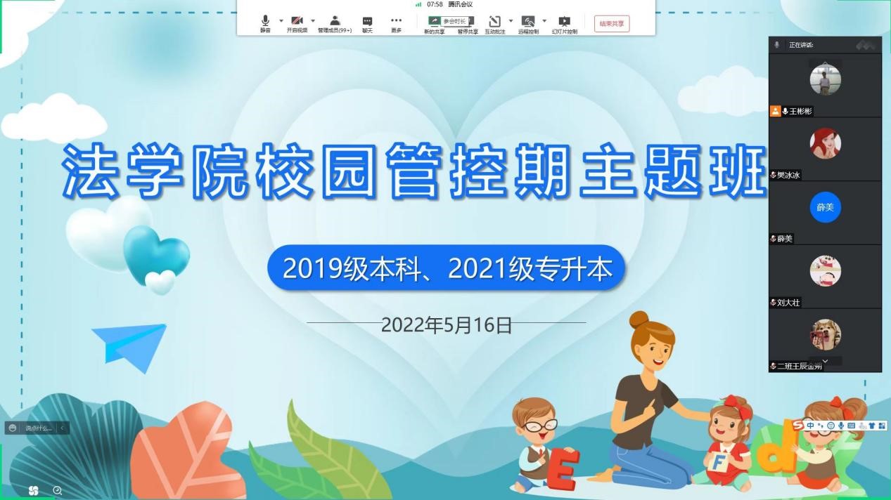 为进一步做好疫情防控工作,强化责任担当、稳定思想情绪,树立必胜信心、积极主动作为,全面配合校园分等级管理,切实保障师生生命安全及身心健康。2022年5月16日,法学院组织开展了“同心战疫共克时艰”校园管控期主题班会、专题党课。主题班会由各年级辅导员组织开展,专题党课由法学院党委书记孟凡根、院长周耀宏、党委副书记刘毅飞讲授。法学院全体学生参加。