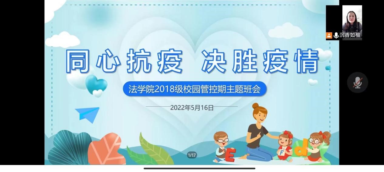 主题班会上,各年级辅导员老师结合学生实际,通过“疫”起分享、“疫”起学习、“疫”起畅想等多个环节开展了一场场有声有色的班会,向全体学生传达学校现阶段疫情防控管理规定、讲述战疫故事,进行心理辅导;引导全体学生遵守纪律,珍惜抗疫成果,全面配合校园做好分等级管理,切实筑牢青年学生抗击疫情的坚定信心。班会上,各年级辅导员还就学生考研、法考、就业等工作进行重点指导,引导学生合理安排学习生活,突破时空限制实现学习新模式。
