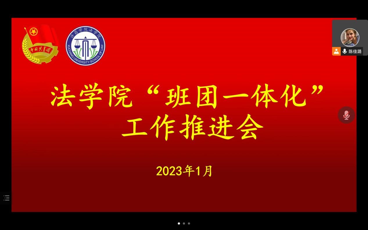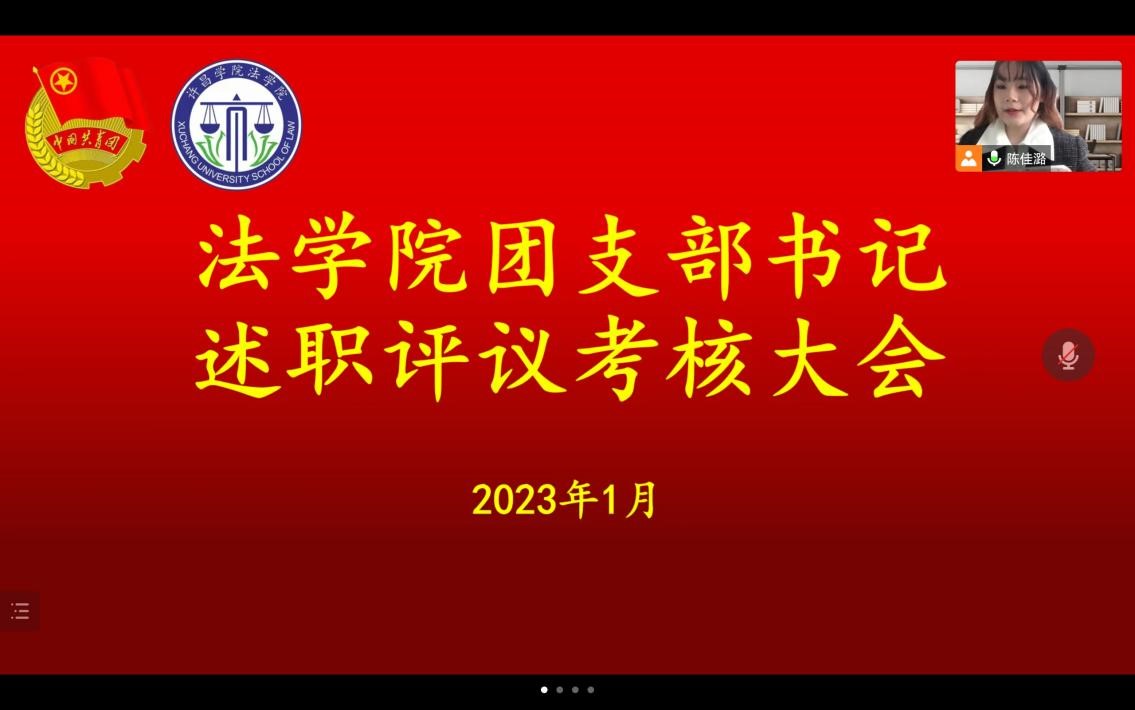 为进一步激发基层团组织活力,加强各团支部基层工作的规范化建设,增强各基层团支部的引领力、组织力、服务力和大局贡献度,2023年1月12日,我院于线上召开2022年度团支部书记述职评议考核大会,法学院团委副书记杨晓丽老师、法学院学生会主席团成员和各班级团支部书记参加本次会议,大会由学生会组织部成员陈佳潞主持。