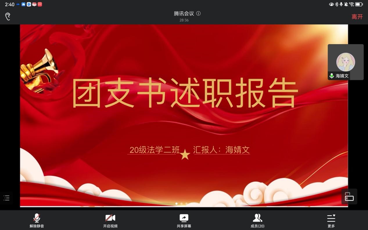 会上,各班级团支部书记依次进行述职汇报,围绕团支部建设、思想引领、志愿服务、学风建设、特色亮点以及工作不足等方面分享成绩和经验,查找不足和问题,并对未来的工作进行展望和规划。最后,法学院团委副书记杨晓丽老师对此次大会进行了总结发言,并对“五型五力”基层团组织建设基石工程和“班团一体会”推进工作进行了详细的讲解和部署。杨老师鼓励各团支部进一步加强团员管理,丰富活动形式,激发青年团员的能动性和创造力,提升支部团员参与度,增强支部团员满意感,加强团支部的吸引力、凝聚力、战斗力。