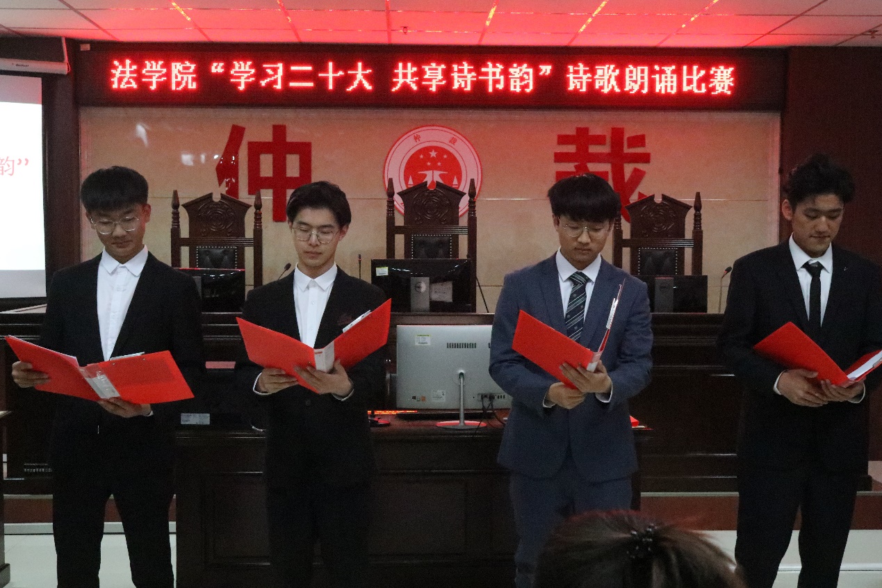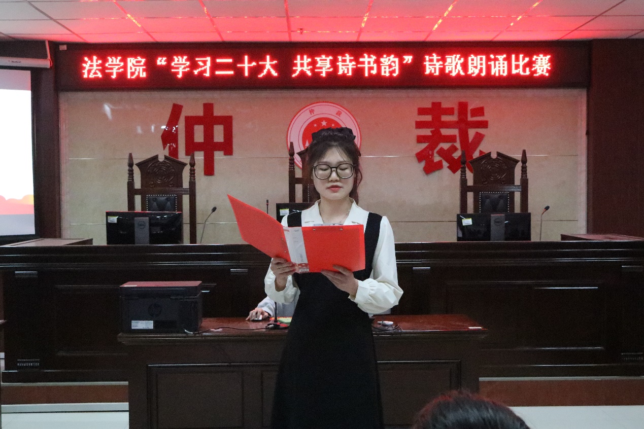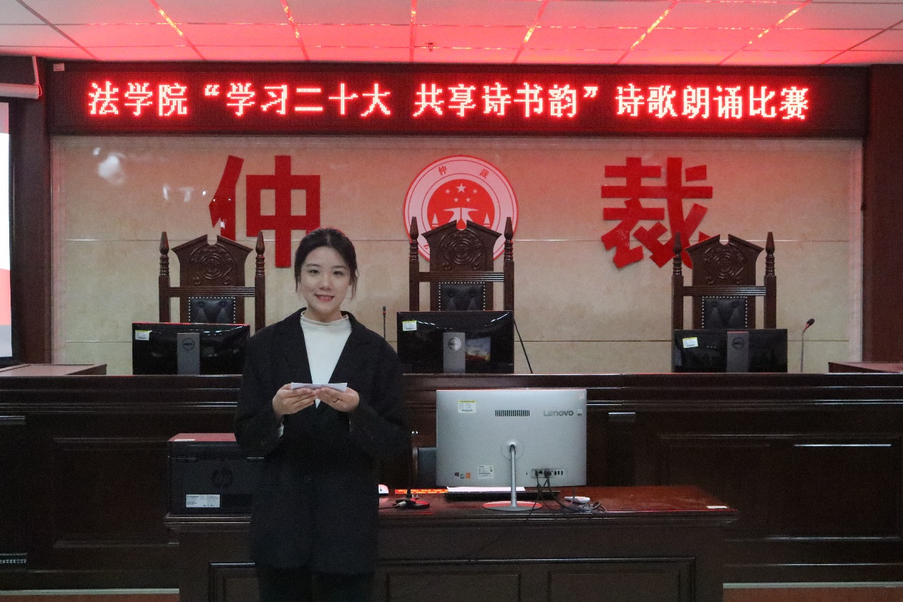 为深入学习宣传贯彻党的二十大精神,抒发青年学生爱党爱国的真挚情怀,展示青年建功新时代的昂扬风貌。2023年3月27日晚上,我院在文综楼717举办了“学习二十大共享诗书韵”诗歌朗诵比赛。法学院团委副书记杨晓丽、学生党员张梦鸽以及学生会主席团成员出席比赛现场并担任评委。本次比赛由张珂冉主持。
