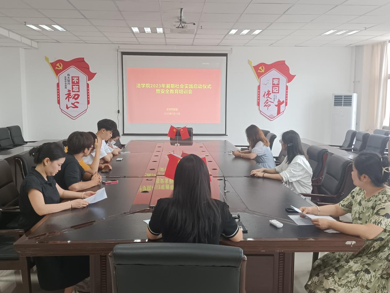 为进一步深入学习习近平新时代中国特色社会主义思想,贯彻党的二十大精神,引领同学们自主投身暑期社会实践,练就过硬本领。6月19日,法学院在E1225会议室举行了2023年暑期社会实践启动仪式暨安全教育培训会,学院团委副书记杨晓丽、学生会主席团成员、各班级团支书以及各实践队指导老师、队长和宣传员参加启动仪式。