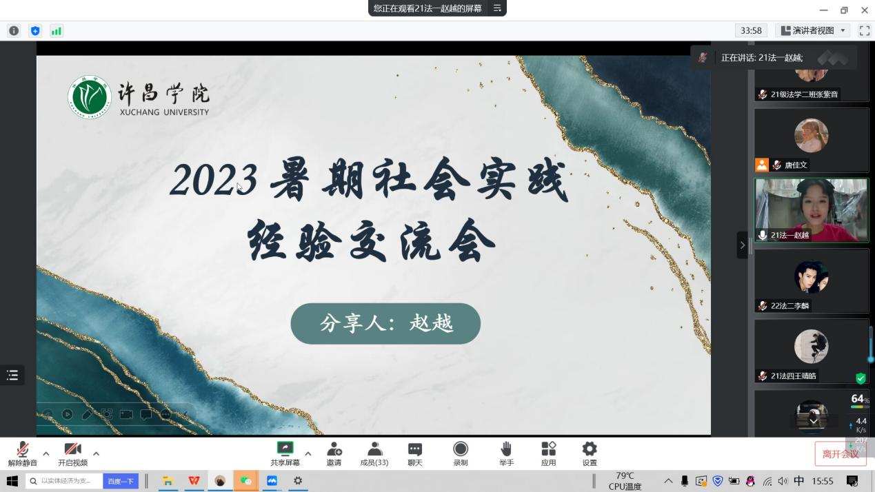 本次启动仪式采用“线上+线下”相结合的形式进行。首先,由法学院团委学生副书记唐佳文详细解读了2023年暑期社会实践方案和指导手册,并重点强调了暑期社会实践组团方式、宣传方式以及材料整理等方面的内容。会上,邀请到2022年暑期社会实践“校级示范队”队长赵越和吕慧慧从实践准备、实践过程、项目申报、投稿方式等多方面为大家带来了社会实践经验分享,他们鼓励同学们结合专业所长,勇于开拓创新,寻找科学有效的实践形式。
