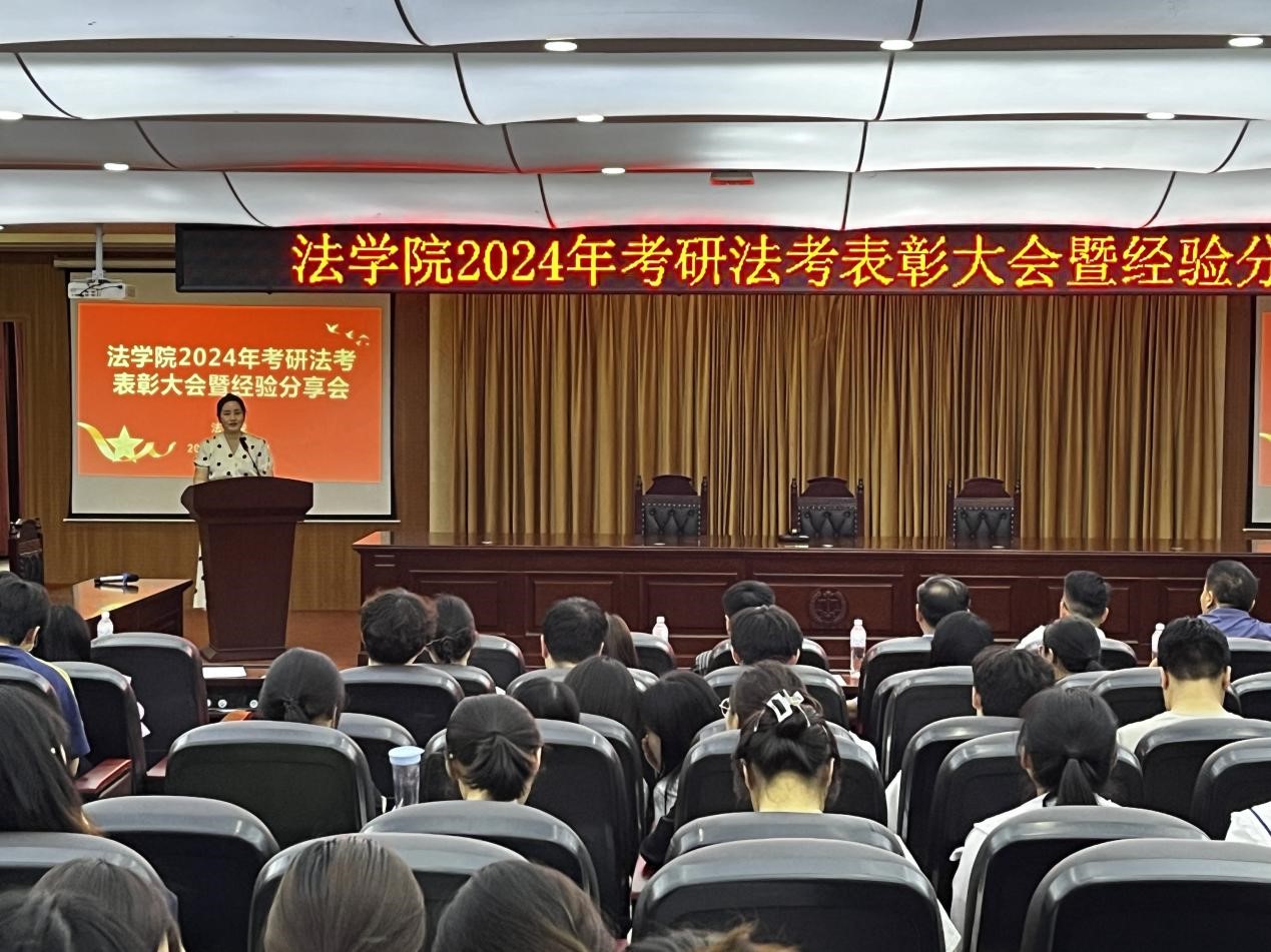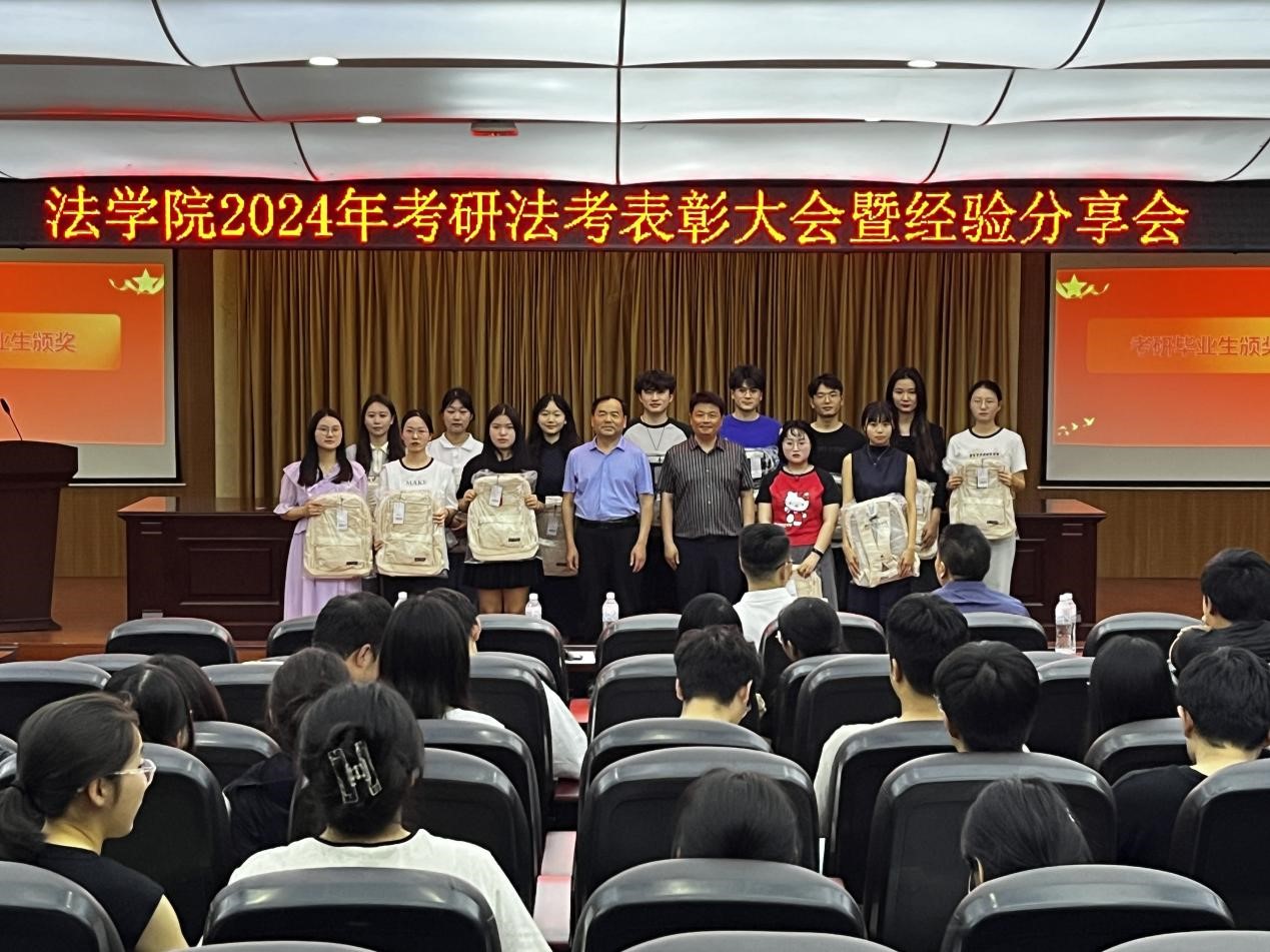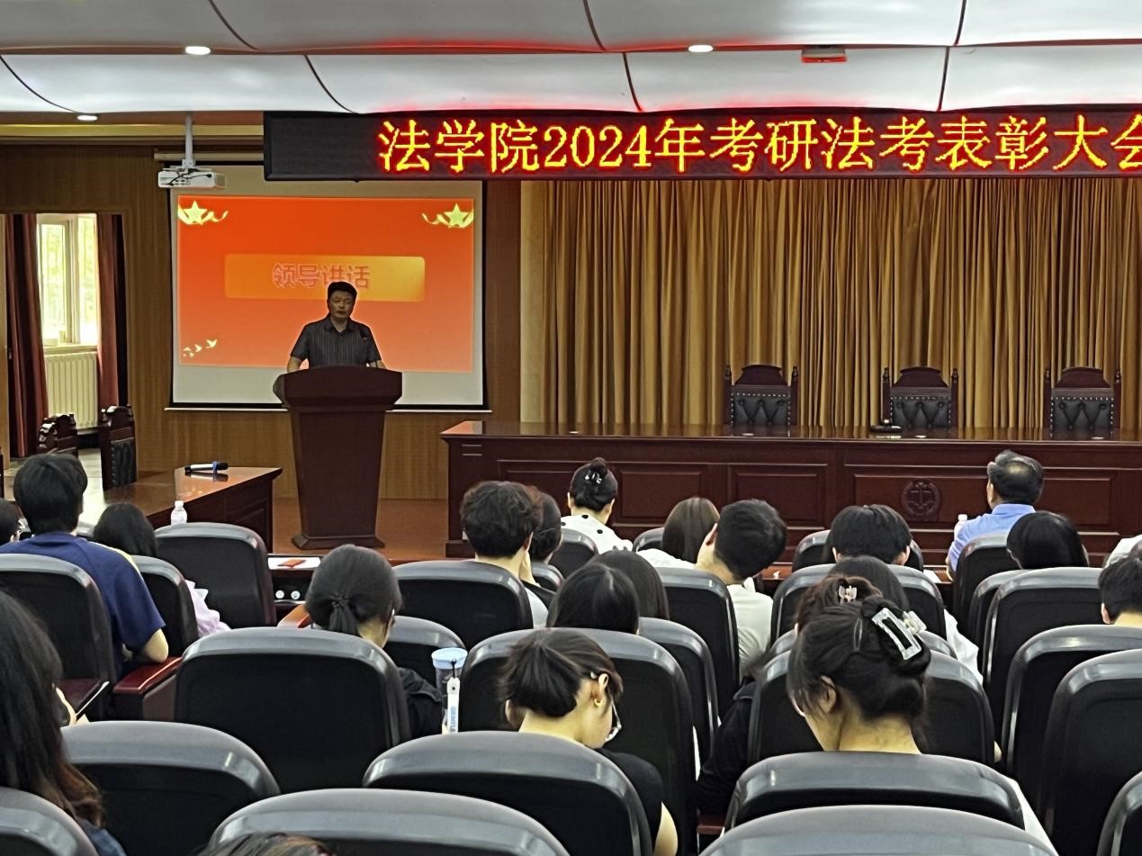 表彰会上,刘毅飞宣读了《法学院关于表彰2024年考研、法考先进个人的决定》。院领导为2024届通过考研、法考的毕业生颁发了奖品。