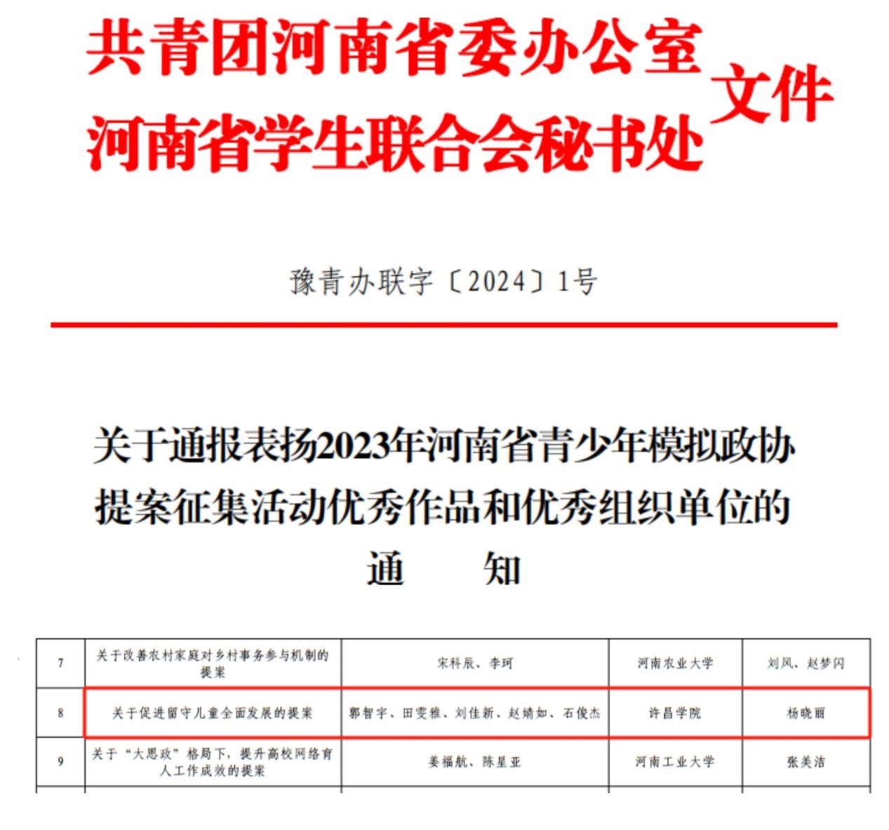 近日,共青团河南省委、河南省学生联合会印发《关于通报表扬2023年河南省青少年模拟政协提案征集活动优秀作品和优秀组织单位的通知》,由我院法学院杨晓丽老师指导、2022级法学1班郭智宇等同学撰写的作品《关于促进留守儿童全面发展的提案》获优秀作品,并入围全国评审环节。这是我院连续三年荣获河南省青少年模拟政协提案征集活动优秀作品,也是我院推荐的作品首次入围全国评审环节。