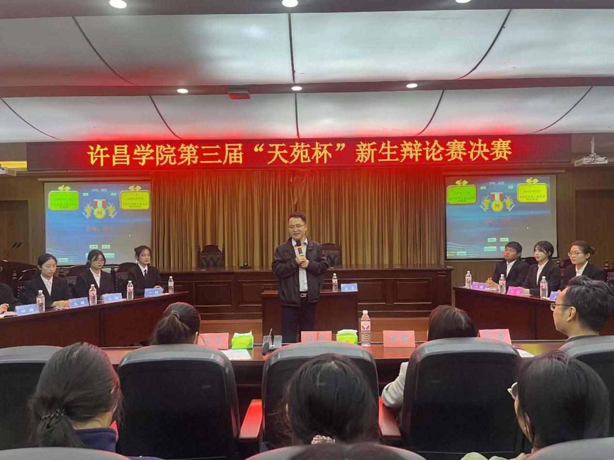 2024年11月3日下午,由我院主办的第三届“天苑杯”新生辩论赛决赛在模拟法庭举行。河南天苑律师事务所副主任杜亚民、副主任郭瑞、法学院副院长孙敬良、院团委书记杨晓丽应邀出席并担任评委,本次辩论赛吸引了我院广大师生到场观赛。