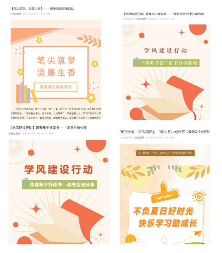 我院开展多形式的学风建设活动,打造线上线下良好学习氛围。2024年,我院利用许院法视界公众号平台开展“英”为热爱,“语”你同行英语学习、最美笔记征集、“墨海书会”好书分享、青春年少好读书等系列活动,营造良好线上学习氛围。2024年,我院邀请李栋、杨建文、刘大洪、焦洪昌等教授开展学术讲座,培养学生的学术思维,打开学术视野。同时,院学生组织积极参与学风建设活动,通过组织法治观影、普法宣传活动,将学风建设融入社会实践中。