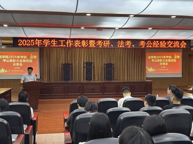 为充分发挥优秀毕业生的示范引领作用,进一步营造良好的学风氛围,5月15日,我院在模拟法庭开展了2025年考研、法考、考公表彰大会暨经验分享会。院长王忠灿,副院长冯振强、孙敬良出席大会。毕业班辅导员李艳玲,2025届考研、法考、考公毕业生及2026届全体毕业生参会。