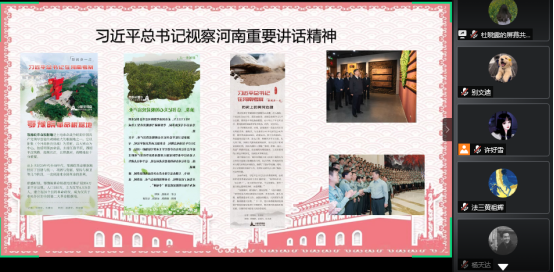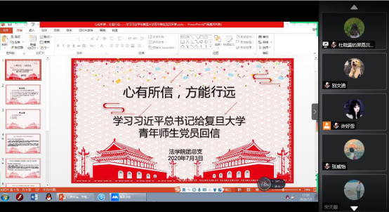 活动中,杨老师首先向大家展示了“习近平总书记给复旦大学青年师生党员回信”。看完回信后,杨老师指出,“心有所信,方能行远”这两句话是习近平总书记对复旦大学青年师生党员的勉励,更是对全体青年学生的殷切期望,面对未来,我们更加要坚定理想信念,矢志拼搏奋斗。紧接着,杨老师依次领学了“习近平给在首钢医院实习的西藏大学医学院学生的回信”、“习近平给北京大学援鄂医疗队全体90后党员的回信”和“习近平总书记视察河南重要讲话精神”。通过这一封封的回信,我们看到的是习近平总书记对青年一代的期望和关心,对我们祖国未来发展的坚定信心。随后,杨老师与在线的同学们一同讨论了回信感受,杜晓露、曹菁等同学也对习近平总书记的部分金句发表了自己的看法,表达了自己作为大学生的初心、使命。
